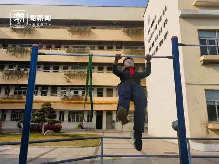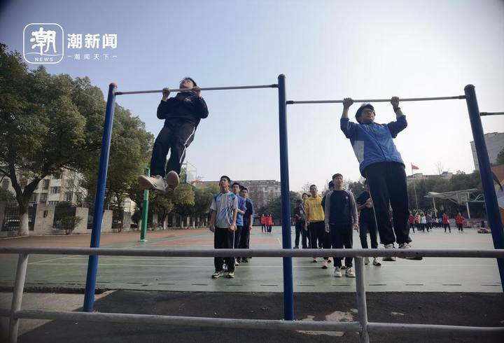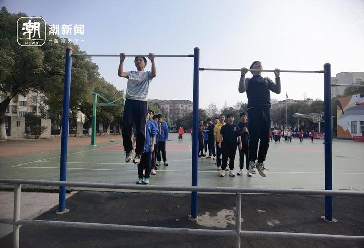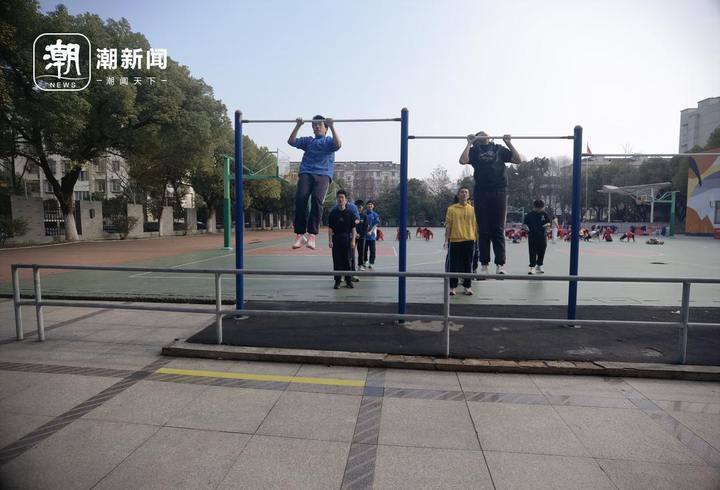 天杭实验学校田径场边的单杠区,利用体育课温习引体向上项目的学生不少,练习前体育老师特地叮嘱学生,考前保持状态即可,不用过度锻炼,避免意外受伤。学生们自动排成两队,擦拭镁粉、起跳抓杆、手臂向上用力、腰腹向上摆动,动作连贯起来轻松得像一只只燕子在空中飞舞。