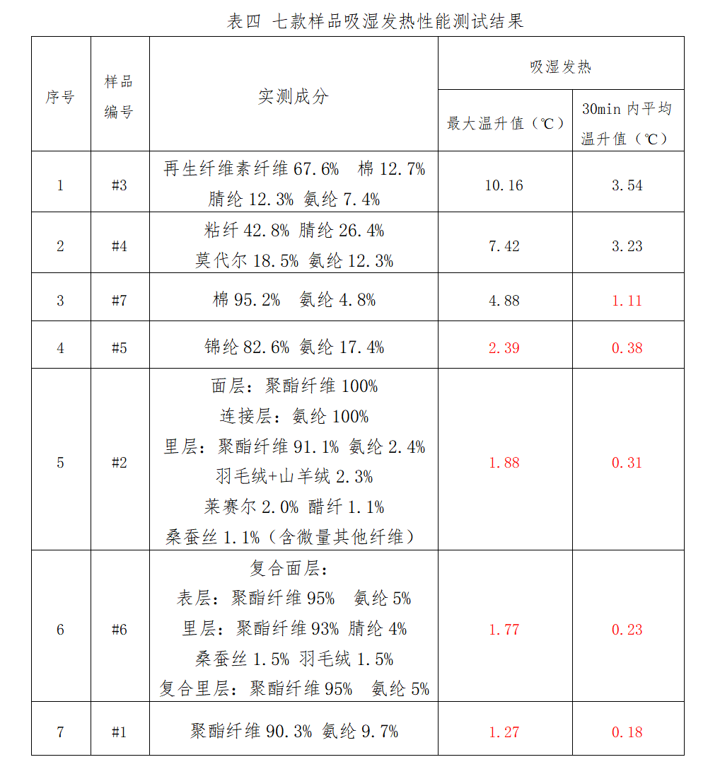 根据表四实验结论,仅样品名称中标注“德绒发热”“德绒自发热”(样品#3、#4)两款产品符合FZ/T 73036-2010《吸湿发热针织内衣》的指标要求。其原理在于真正具备吸湿发热效果的产品需依赖于“再生纤维素纤维(如粘纤、莫代尔)”与“腈纶”的科学配比,并非所有宣称“发热”的产品均具备该性能。