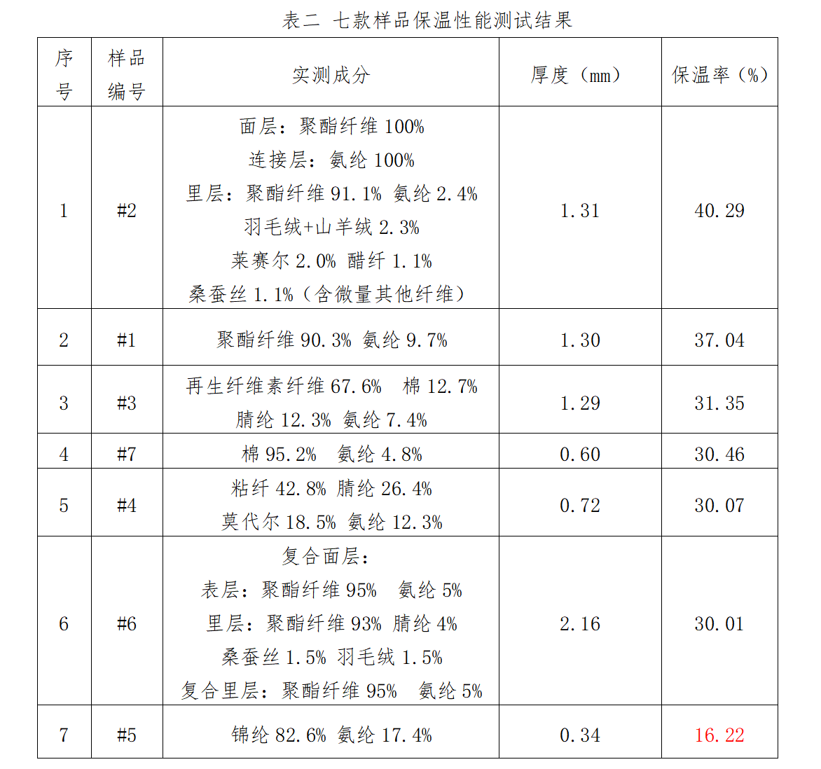 根据表二实验结果,产品保温性能与面料的厚度和成分有关,但面料厚度并非决定保暖效果的单一因素,个别较厚产品保温率仅略高于标准线。有必要注意一下的是,当面料过于轻薄时(如样品#5,厚度仅0.34mm),其保温率仅为16.22%,并非真正的“保暖内衣”。此外,聚酯纤维(涤纶)含量高的产品在保温表现上总体较好,这与其纤维结构能有效储存静止空气、减少热量散失的特性相符。