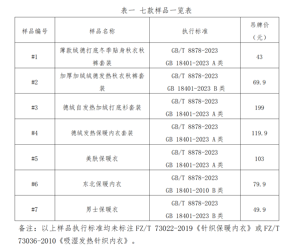 宁波市质检院纺织品检验部以“保暖内衣”“德绒内衣”“自发热内衣”等为关键词,在主流电子商务平台选购了7款销量突出的不一样的品牌产品(样品名称、执行标准分别如表一所示),依据FZ/T 73022-2019《针织保暖内衣》、FZ/T 73036-2010《吸湿发热针织内衣》,对其保暖性能、透气性能和吸湿发热性能进行检测。
